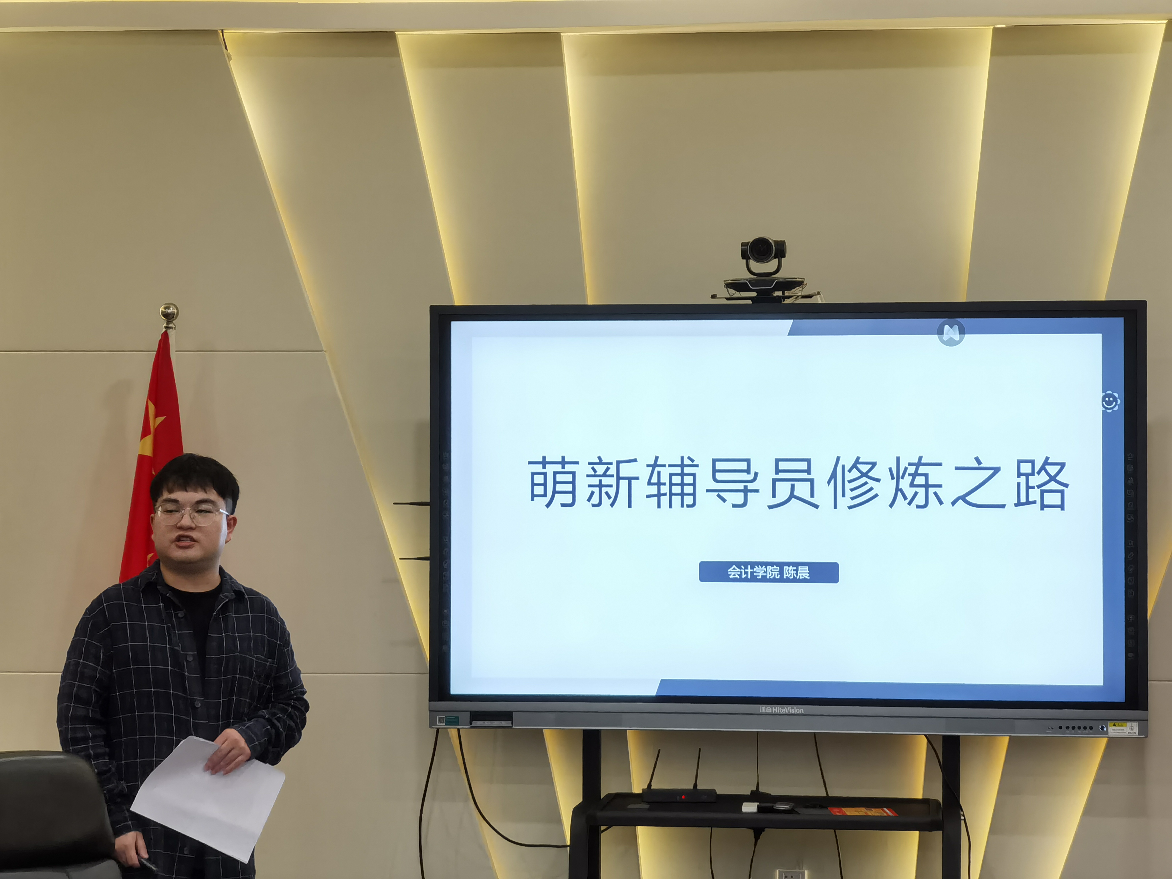 陈晨老师以“萌新辅导员修炼之路”为题,分享了自己在辅导员岗位的工作经验和心得体会,陈晨提出规范班级制度,严格执行校规校纪,刚柔并济是关键。其次,他围绕如何与学生相处,提出“四个要”:一要多跑,跑寝室,跑进学生心里;二要多听,听班委和学生的内心想法;三要多谈,与学生谈学习谈纪律;四要多想,做到工作前思考,工作后反省,更好地服务学生。陈晨老师把自己的辅导员工作月历分享给了大家。